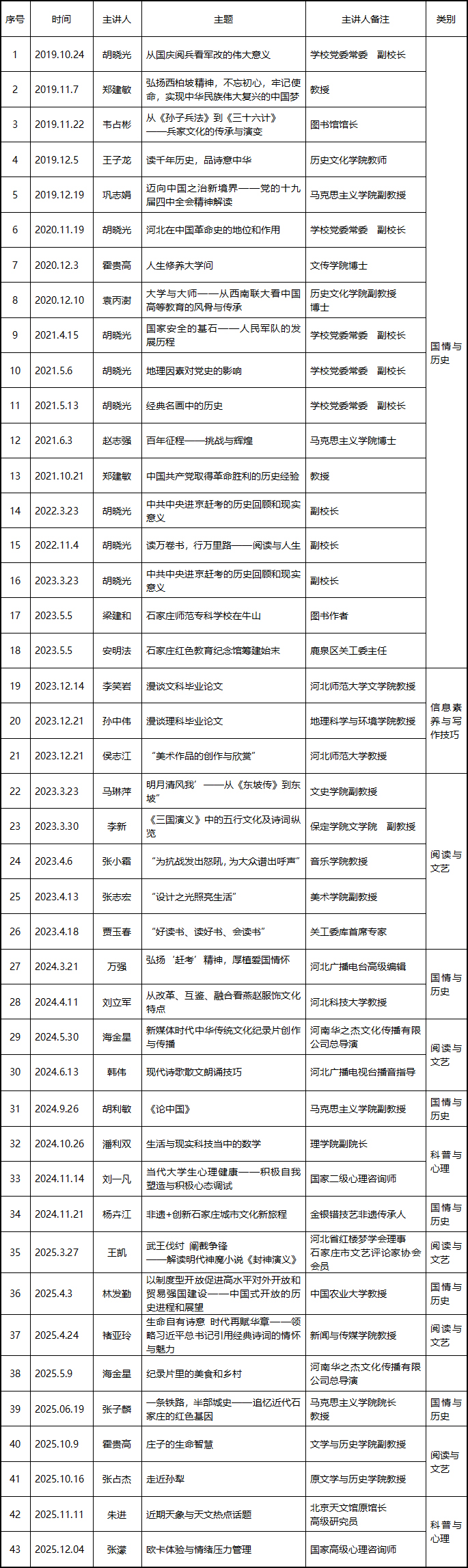 2024年在读者中展开广泛调查,听取师生建议,在这三个系列之外拟开设科普、心理、青春论坛等类别的系列讲座。并且把这些讲座集中命名为“棠华讲坛”,撷取棠韵,和棠满石院交相呼应,让文化的芬芳遍布整个校园。