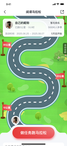 读者进入活动页面,点击【做任务跑马拉松】按钮参与本活动,根据页面指引选择任务,完成任务后可领取对应的公里数,活动页面实时展示用户累计收集的公里数、所到达的里程数、及参与活动的全部用户里程排行榜。