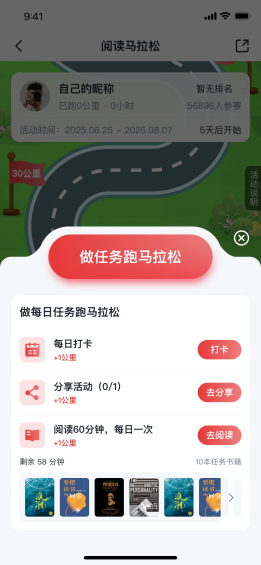 2.每日阅读每满5分钟,可累积1公里里程,当日阅读时长最多不超过8小时;