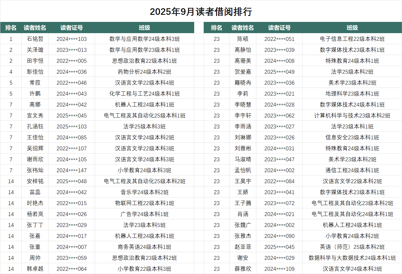 本榜单统计了2025年9月纸质图书借阅册次排名靠前的学生读者。入选本榜单的学生读者将获得读者积分奖励,该积分将计入年度校园“阅读之星”评选总积分。
