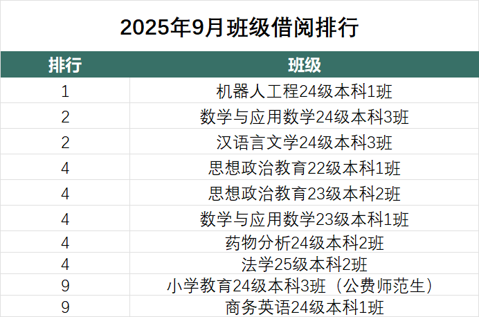 本榜单统计了2025年9月纸质图书借阅册次排名前10(含并列)的班级。
