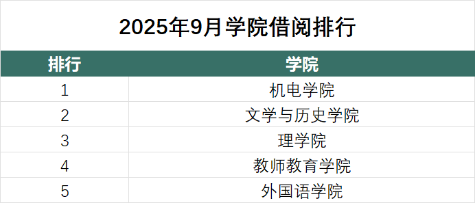 本榜单统计了2025年9月纸质图书借阅册次排名前5的学院。