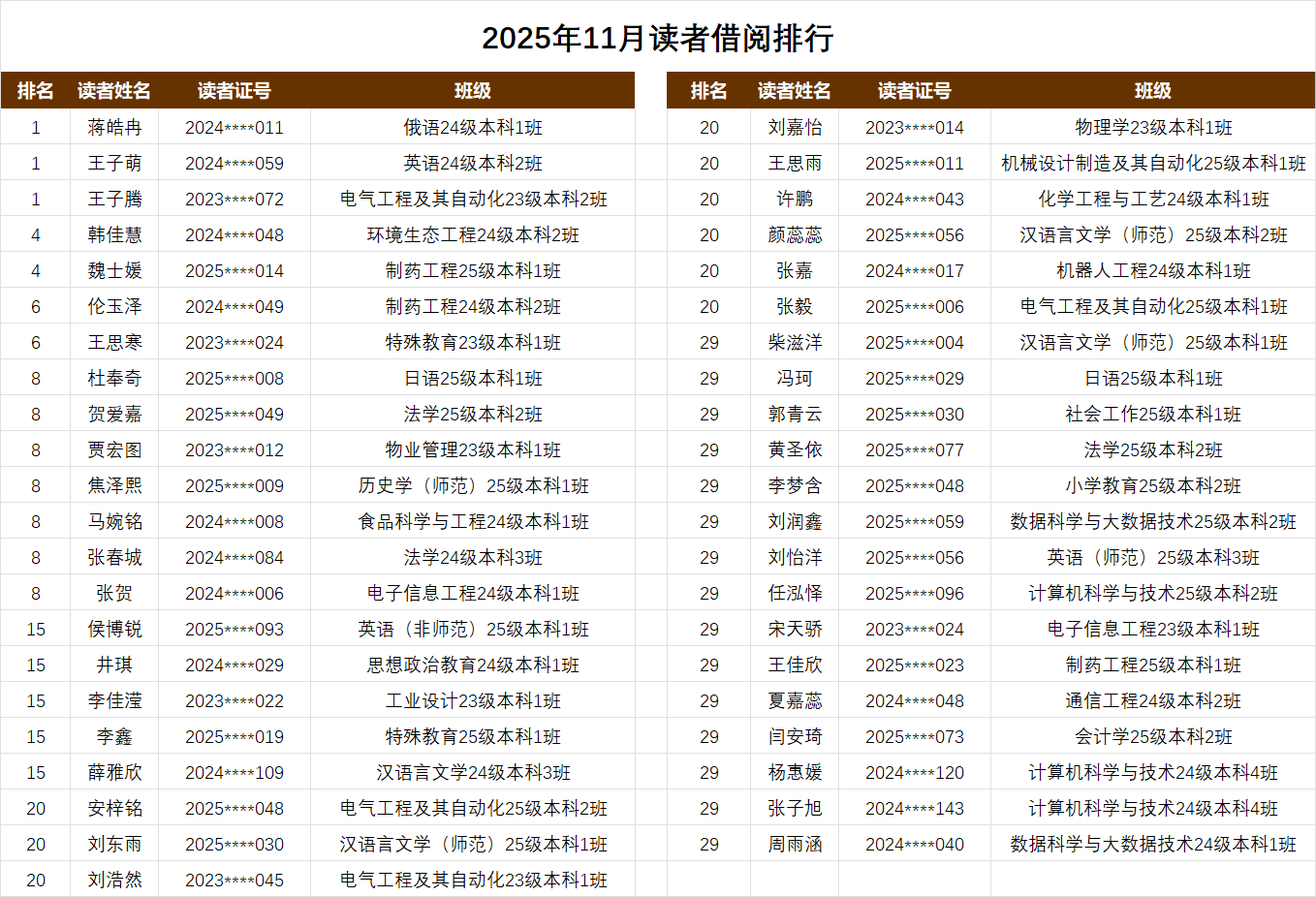 本榜单统计了2025年11月纸质图书借阅册次排名靠前的学生读者。入选本榜单的学生读者将获得读者积分奖励,该积分将计入年度校园“阅读之星”评选总积分。