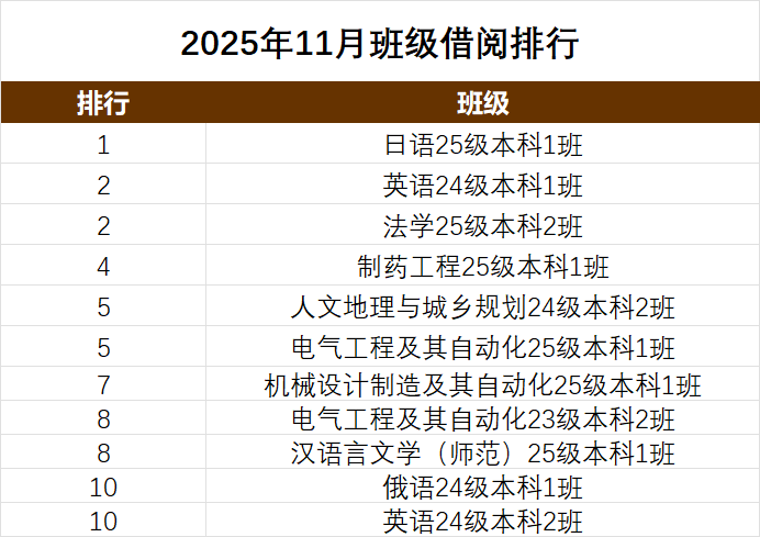 本榜单统计了2025年11月纸质图书借阅册次排名前10(含并列)的班级。
