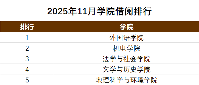 本榜单统计了2025年11月纸质图书借阅册次排名前5的学院。
